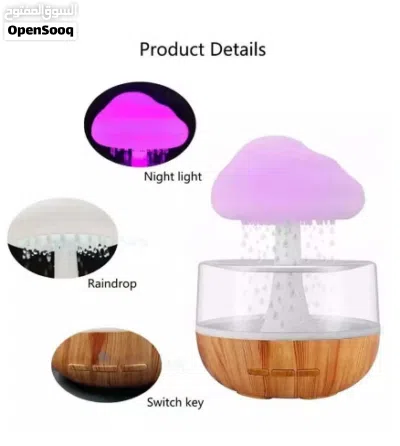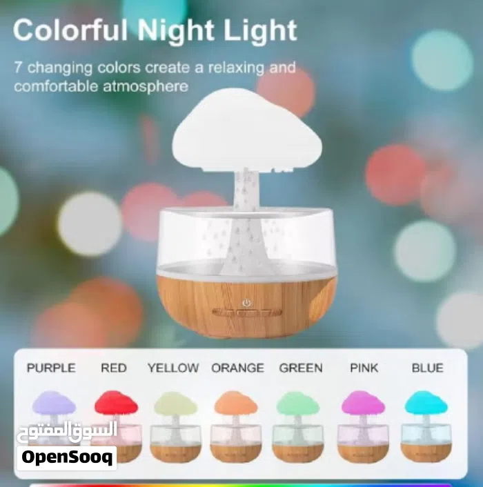 مرطب هواء على شكل سحابة مطر، موزع زيوت عطرية لطيف بقطرات الماء مع 7 مصابيح LED، ضوء ليلي على شكل سحا