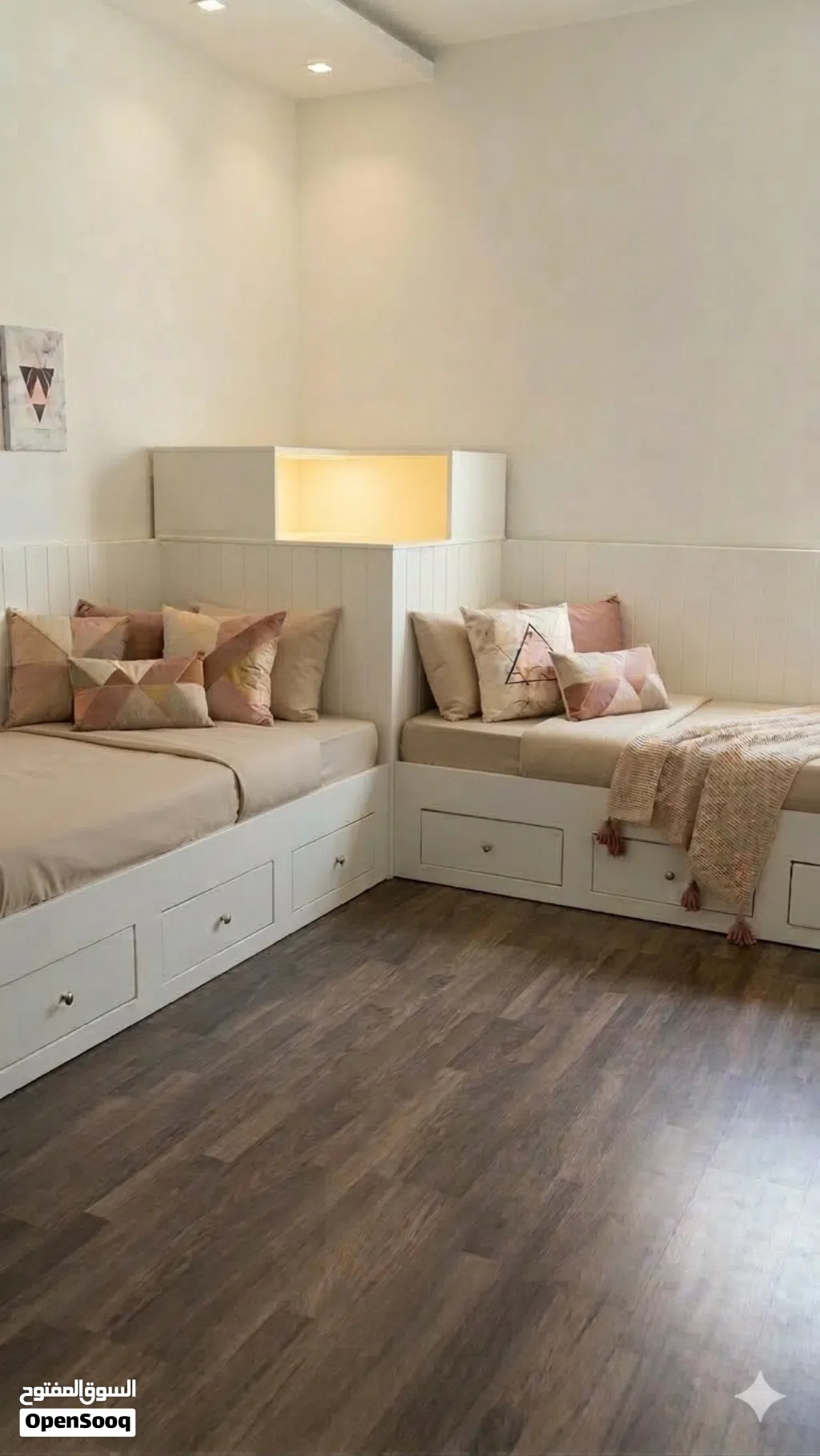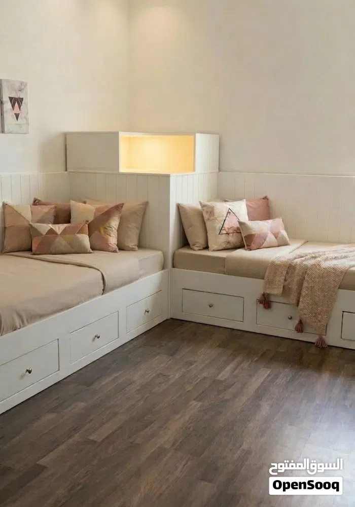 للبيع سريرين بحالة ممتازة، تصميم مودرن وعملي (تفصيل خاص وليس جاهز).