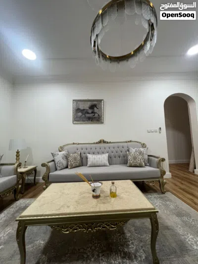 ( 2 قطع كنب ثلاثي - 1 قطعه كنب ثنائي - 2 قطعتين مفرده - 1 قطعه بف - طاولات رخام 1 قطعه كبيره 3 قطع مربع - 2 ستاره بوكس مخمل - فرشه )